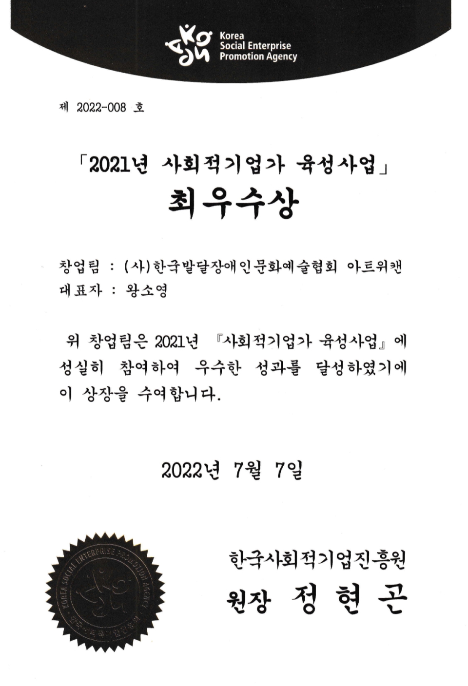 2021년 사회적 기업가 육성사업 최우수상 아트위캔 대표 왕소영